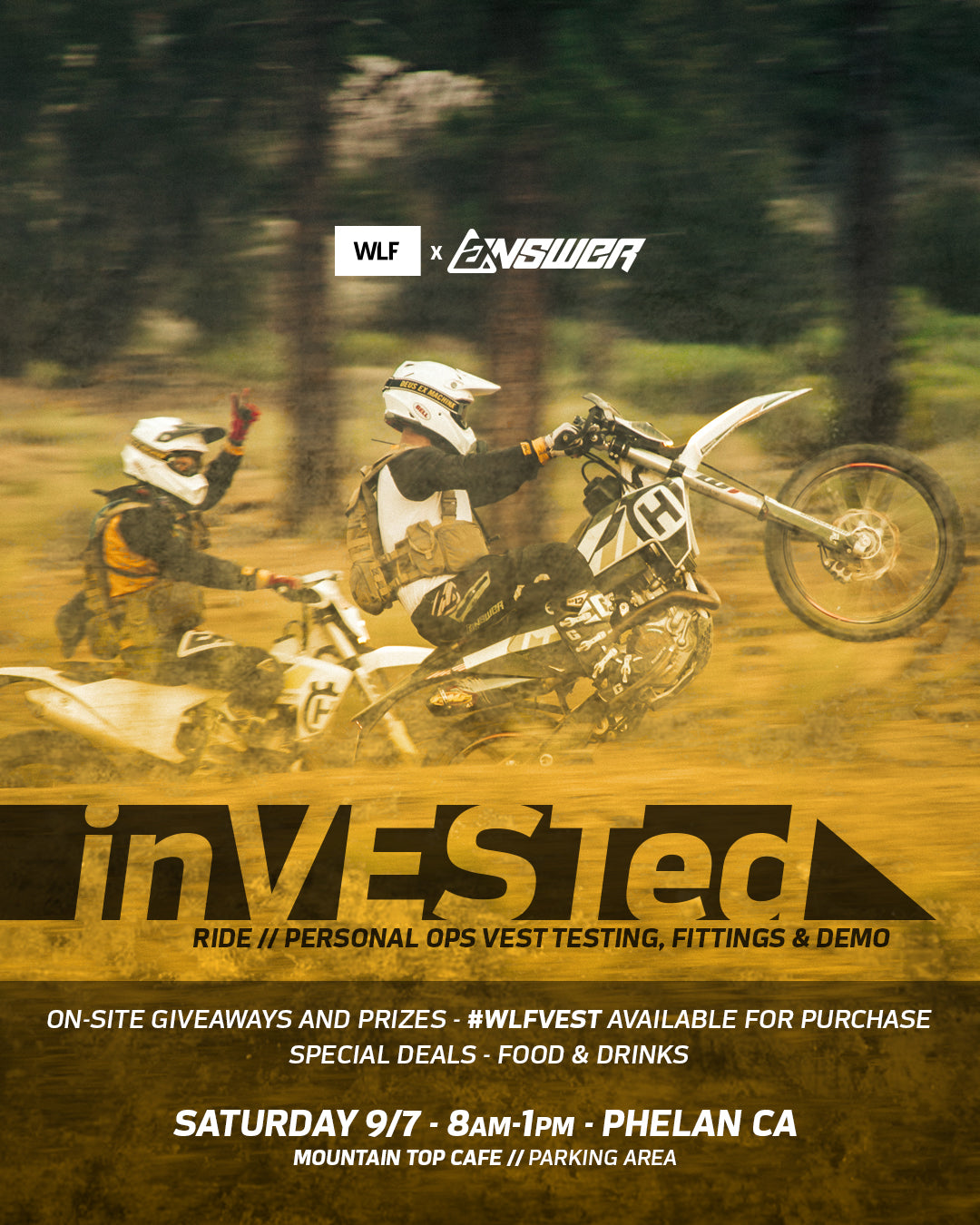 W.E. are inVESTed in you. ✊ Come ride, enjoy some eats / drinks and get your hands the #wlfVEST! If your the type of person that needs to touch, feel and “ride one before ya buy one” this is a perfect chance to do so. OR if ya purchased your #wlfVEST already and just want to come for the good times and the snacks to pack out your vest we’d love to have you out to hang and catch up in real life.