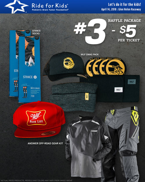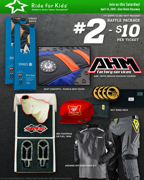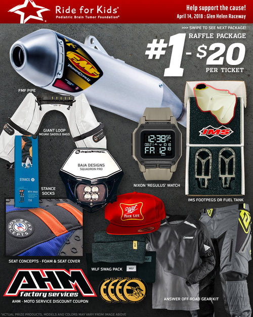RAFFLE TO HELP CURE THE KIDS! If you were unable to make the ride this year it is not too late to help. We have raffle tickets for sale on 3 amazing prize packs loaded with high quality performance products and gear from some of the best brands in the biz FMF73, AnswerRacing, GiantLoopMoto, AHMfactoryservices, IMSproducts, Nixon, SeatConcepts, Stancesocks BajaDesignOfficial!! The raffles will be drawn this Friday and 100% of the proceeds go to the Pediatric Brain Tumor Foundation. Our humble goal is $5,000. Help us reach that, if not more and possibly take home some epic goods! Good Luck!!