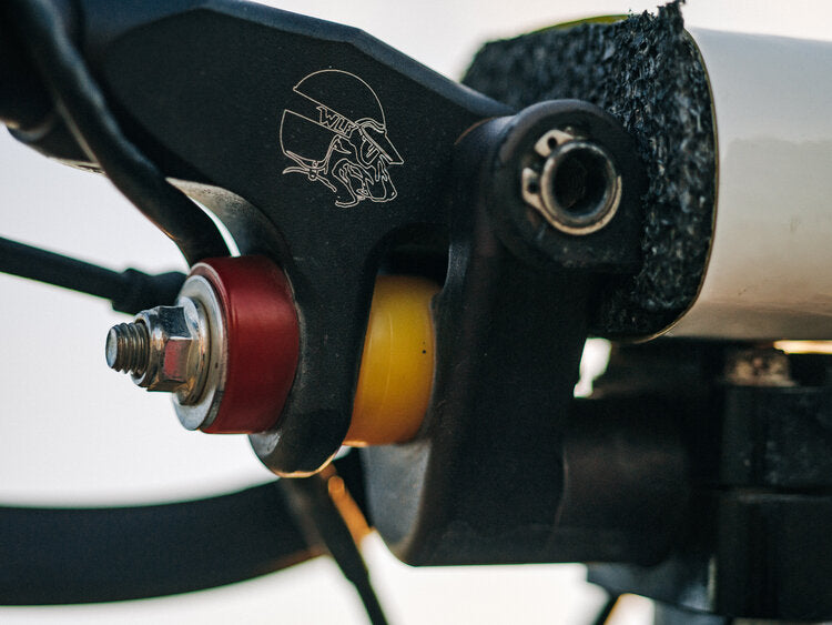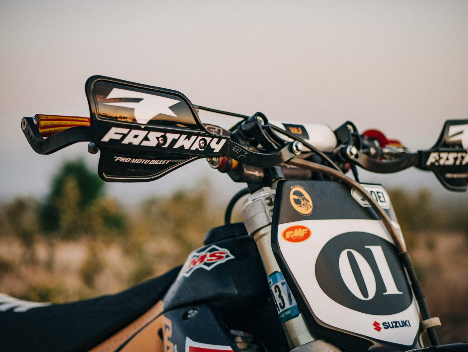 There is something about sitting in the cockpit of the RM that makes your mind flash back in time. You feel like the bikes taking you on a journey thru time and space and its this energy that makes these little machines such a joy to be around. It was a perfect fit and sit but just wanted to update the ergonomics a bit. Anyone over the age of 25 that has said things like “my PT or chiro says I need to stretch more” OR “I heard yoga will keep you rolling for the next 20 years” try some FASST company Flexx bars and call us in the morning. There was a set floating around and became a perfect hand me down add on to the smoker. Rounded out the entirety of the build with some solid protection on Pro Moto Billet Hand Guards. The perfect touch with bark busters that protect knuckles and levers when the going gets tough. No matter if it's a high or low rate of speed tumble, this bad boy is covered.Â
