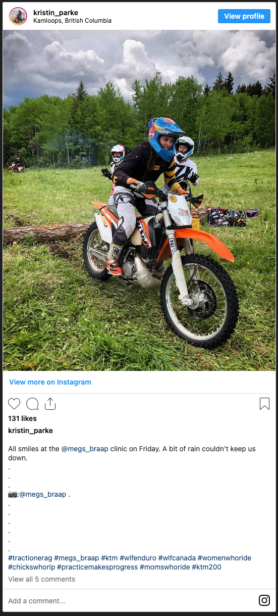One of the first women riders I started following on social media was Megan Griffiths (@megs_braap). Her positive attitude and passion for dirt bikes was always such an inspiration. When the opportunity to attend one of her clinics with Traction eRag came up, I made sure I was able to attend. Practicing basics, and learning proper techniques with her was such a beneficial experience. She made the day into an encouraging environment and after a day full of laughs, a few fails, and some successes I walked away with the tools needed to help further my skills, and better my riding. I’m looking forward to putting in the time to continue practicing what I learned and seeing how it translates to the trails.