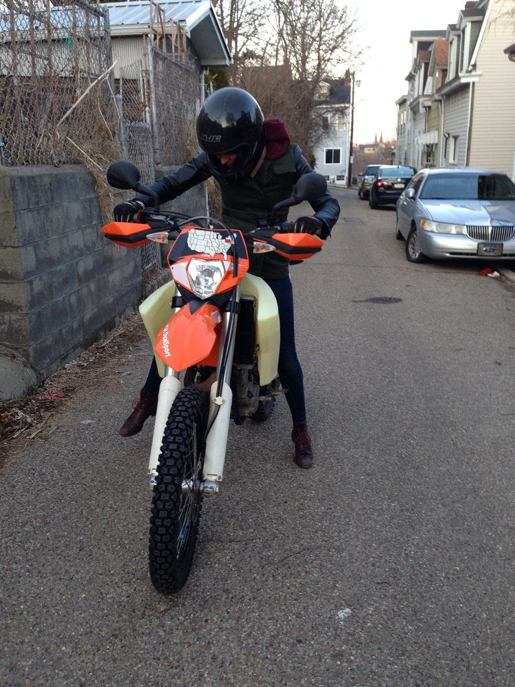 Fast forward to 2013 — the year I moved to Pittsburgh for a job and when I met my boyfriend, Adam, the one who completely changed my life with riding. He first taught me how to ride on a 2011 KTM EXC 450. Even at 5’9 I struggled to touch the ground with my tiptoes and was going about 5mph down a pot hole infested alley. At that point I just wanted to learn how to ride street and would have never thought that I would become obsessed with riding off-road.