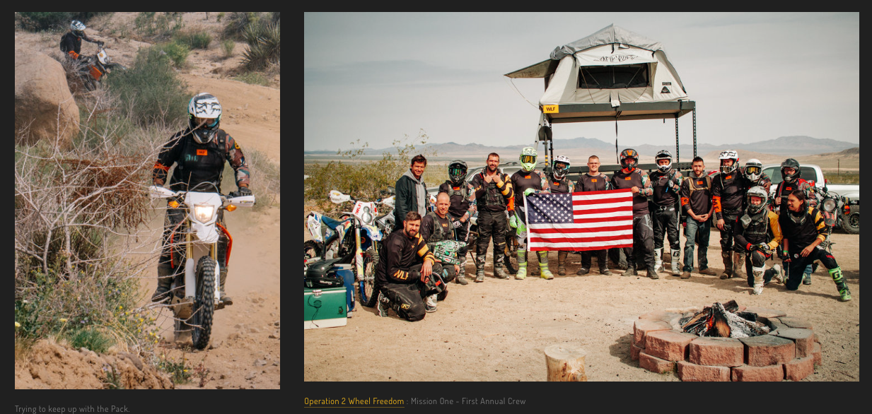 Recently I had the pleasure of linking up with the WLF-Pack on Operation 2 Wheel Freedom, a military veterans ride they hosted on their So Cal home turf. On my drive there, I remember feeling slightly nervous about riding with these skilled and seasoned riders. What was I doing driving to the desert to meet these people I only knew through Instagram? It did not take long for me to realize how generous and down to earth this group of guys was. There weren't any egos - everyone was super accommodating and patient, giving me pointers along the way, keeping the pack tight.