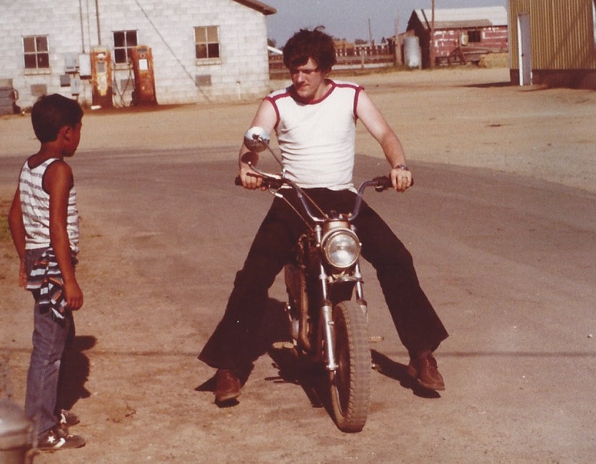 In the summers I would spend a lot of time on my Aunt and Uncles Dairy farm, Jack and Louise Vierra (I owe them a lot of credit) there was a haggard old Honda trail 110 that I would use to go irrigate the alfalfa, a simple 30-minute job would turn into an all-day project! In one of the storage barns, my cousin Ray had an old Suzuki 250, I couldn’t kick start it, so I would push it to the top of the loading dock ramp, click it into 3rd gear run as fast as I could and PRAY!