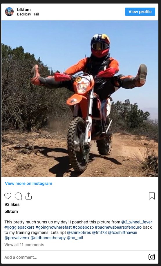 I have a few shout outs: Pro Valve, Liquinox, FMF and Lil-D, Shinko Tires Brian Morris for kicking it off and Kyle Isaacs for keeping it going, Paul Davis from Dragon, Blake from Tec Color Craft, No-Toil, Brett at CTI knee braces, Aubry at FOX, enduro coach Johnny Ringo, the incredible founders of WLF Enduro, Golden Road Brewery, Epicuren Discovery for keeping me and pretty, my ever loving wife Tamara, and my daughter, Mikayla for her courage and inspiration.